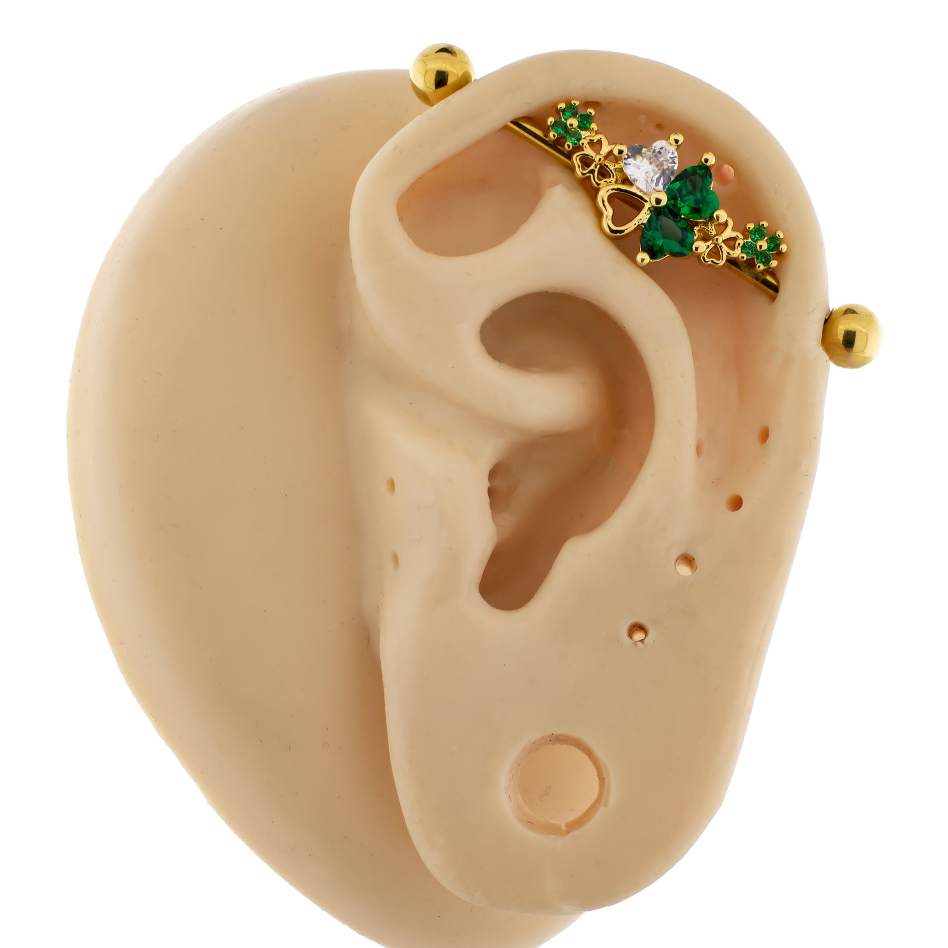 This stunning piece features a captivating combination of green and clear gems arranged in the shape of a charming clover. Adorned with intricate gold clover cutouts, it exudes a touch of whimsical elegance and style. The barbell comes fully assembled on a 14G 1-1/4" externally threaded industrial barbell with 5mm balls and is packaged with an extra 14G 1-1/2 and 1-3/8 barbell, along with extra silicone rings and 2 additional balls for added convenience and versatility. Silicone rings are attached behind the charm, allowing for adjustability to ensure a perfect fit for any ear.