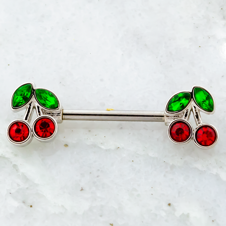 14G 9/16" externally threaded barbell adorned with a charming red gem cherry on each end, complemented by vibrant emerald green gem leaves. The intricate detailing of the cherry and leaves adds a playful and elegant flair to your look.