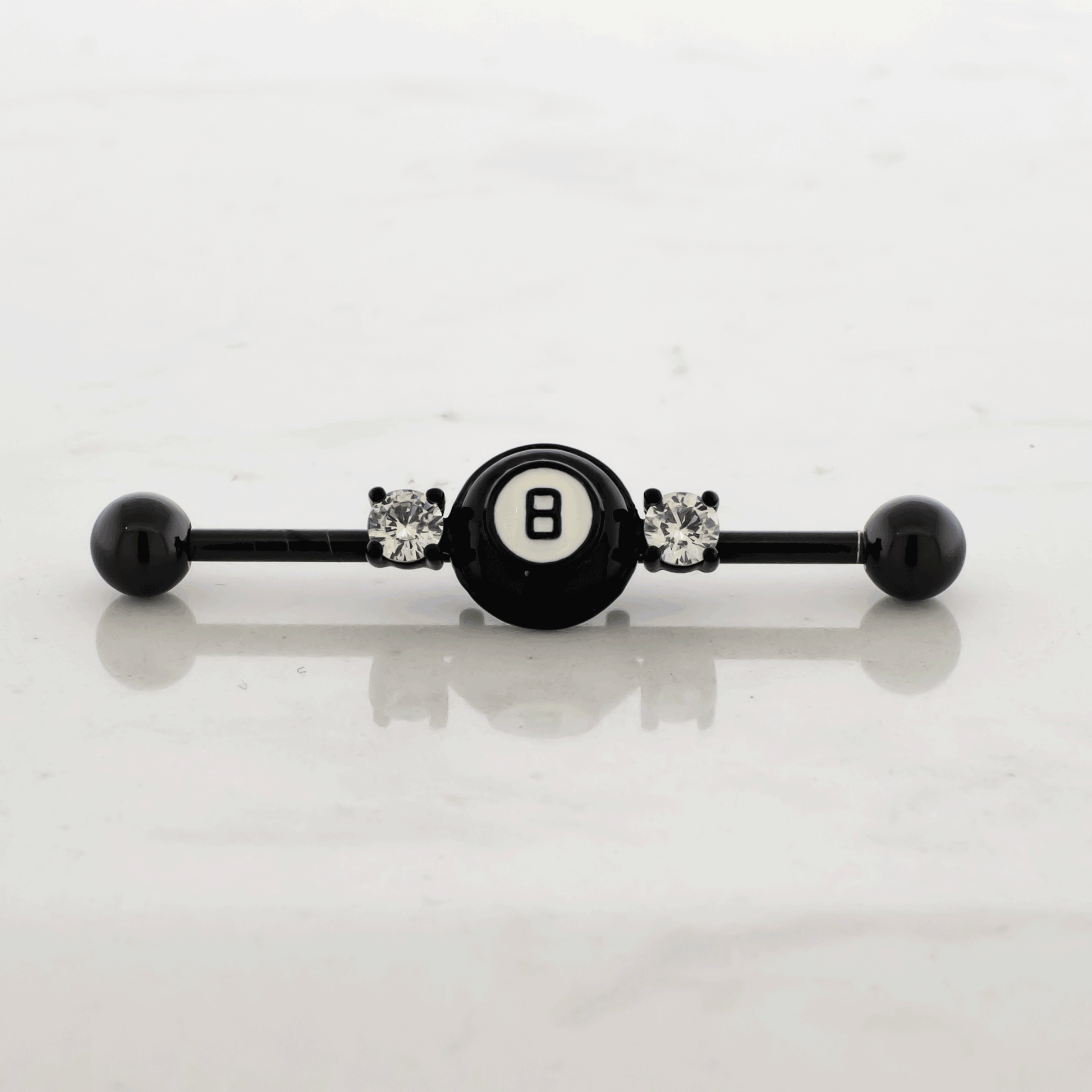 Upgrade your industrial piercing game with this edgy 14g black PVD-coated barbell. Highlighted by a black-plated eight-ball charm, it’s accented with dazzling clear gems on either side for an added touch of brilliance. This piece is fully adjustable, thanks to silicone rings placed behind the charm, allowing for customization. It arrives pre-assembled on a 1-1/4” barbell and includes extra 1-1/2” and 1-3/8” bars, additional silicone rings, and two extra replacement balls for versatility and convenience. Perfect for those who love bold, striking designs.