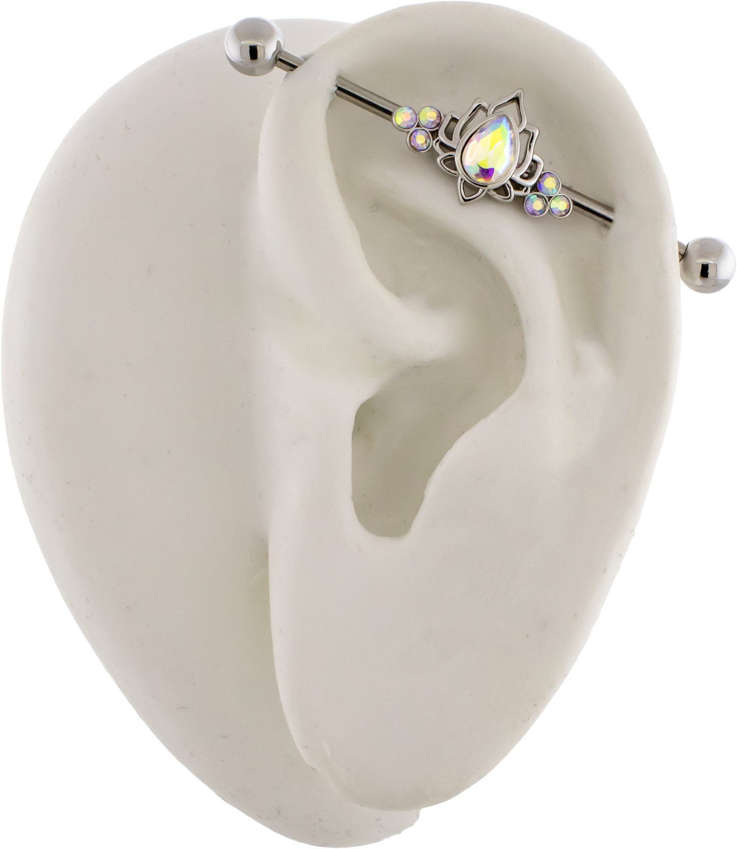 This exquisite piece features gemstone accents surrounding a stunning teardrop gemstone nestled in the center of a delicate lotus flower design. Crafted with attention to detail, it exudes elegance and charm, adding a touch of natural beauty to your industrial piercing. It comes fully assembled on a 14G 1-1/4" externally threaded industrial barbell with 5mm balls and is packaged with an extra 14G 1-1/2 and 1-3/8 barbell, along with extra silicone rings and 2 additional balls for added convenience and versatility. Silicone rings are attached behind the charm, allowing for adjustability to ensure a perfect fit for any ear.