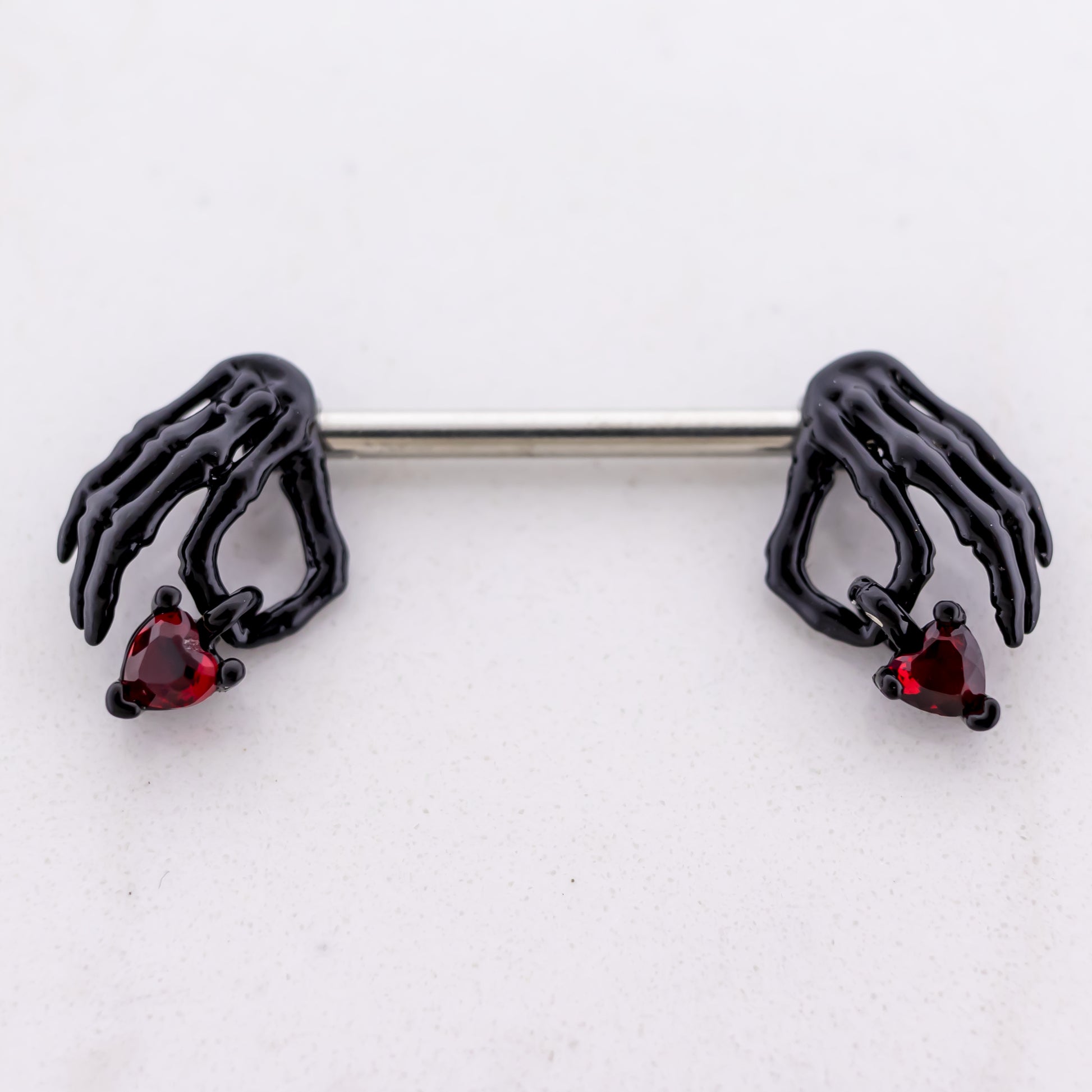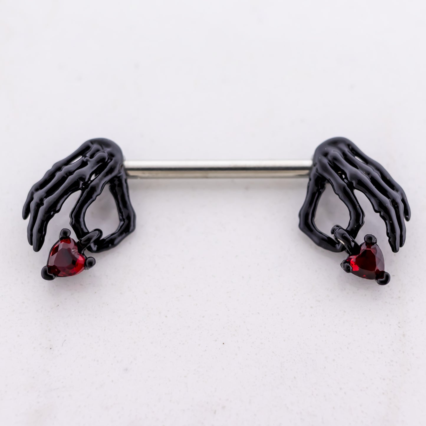 This 14g 9/16" externally threaded straight nipple barbell is a striking piece, featuring intricately detailed skeleton hands gripping a vibrant red gemstone heart. Designed for those who appreciate bold and edgy styles, this barbell offers both comfort and style in one. The durable construction ensures long-lasting wear, while the unique design adds a touch of dark elegance to any look. Perfect for making a statement, this skeleton hand and gemstone heart barbell is sure to stand out in any collection. Sold individually.
