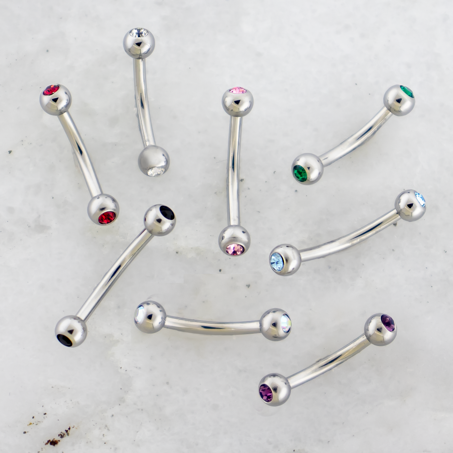 This 16G Bezel Set Externally Threaded Curved Barbell features a 3mm ball accented with premium crystal on each end and crafted in implant grade 316L steel. Available in 8 vibrant colors, it is designed for both fashion and comfort, making it a great choice for eyebrow or rook piercings.