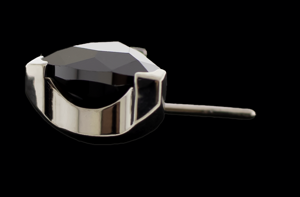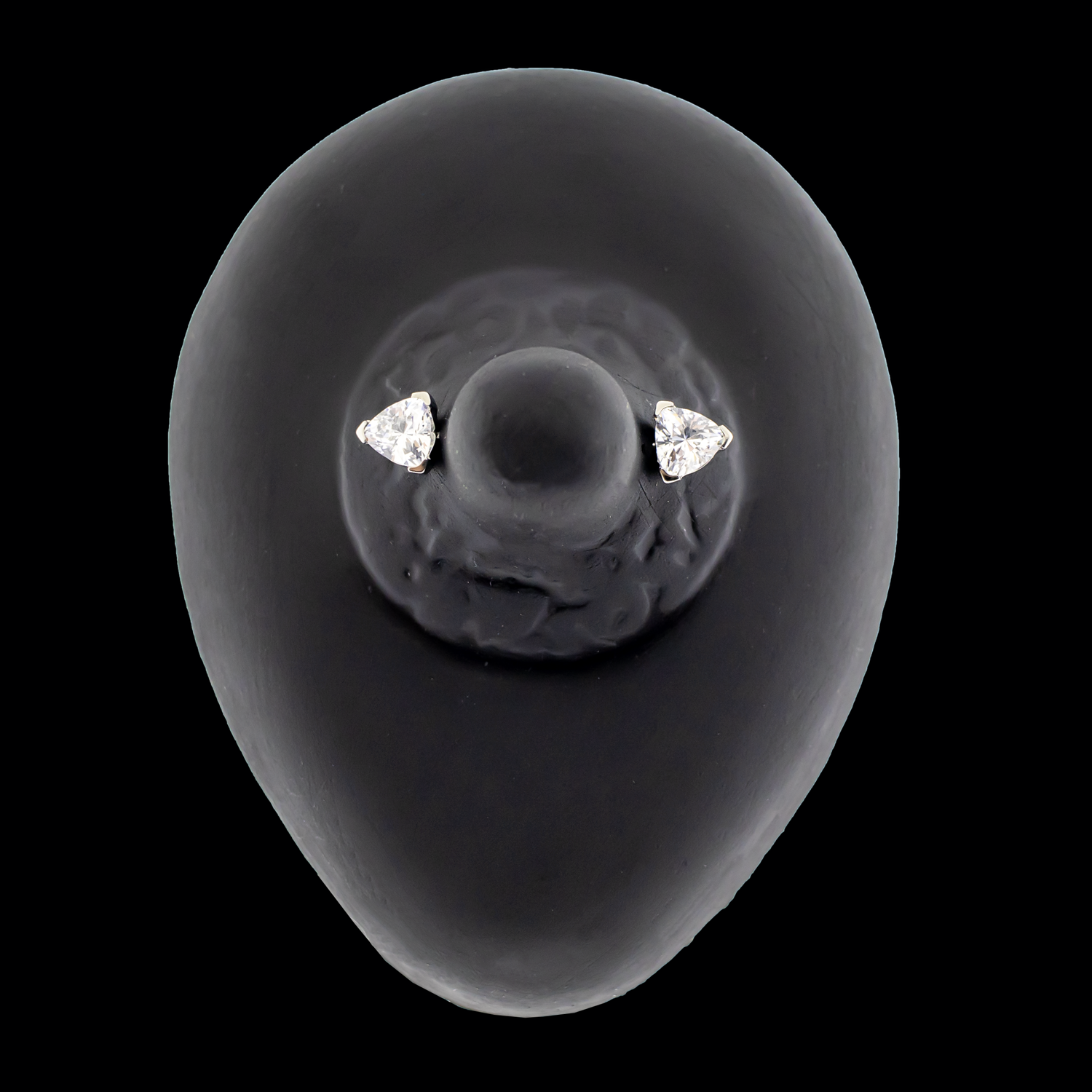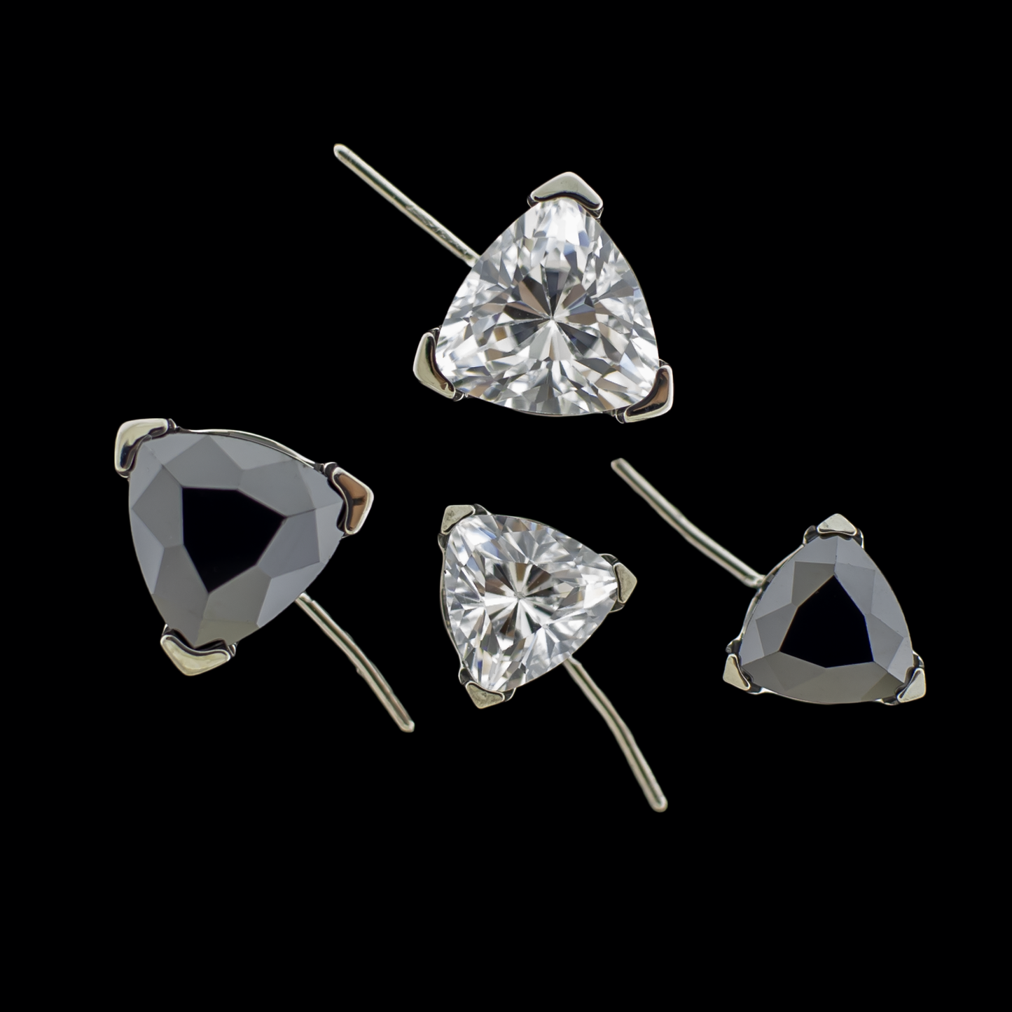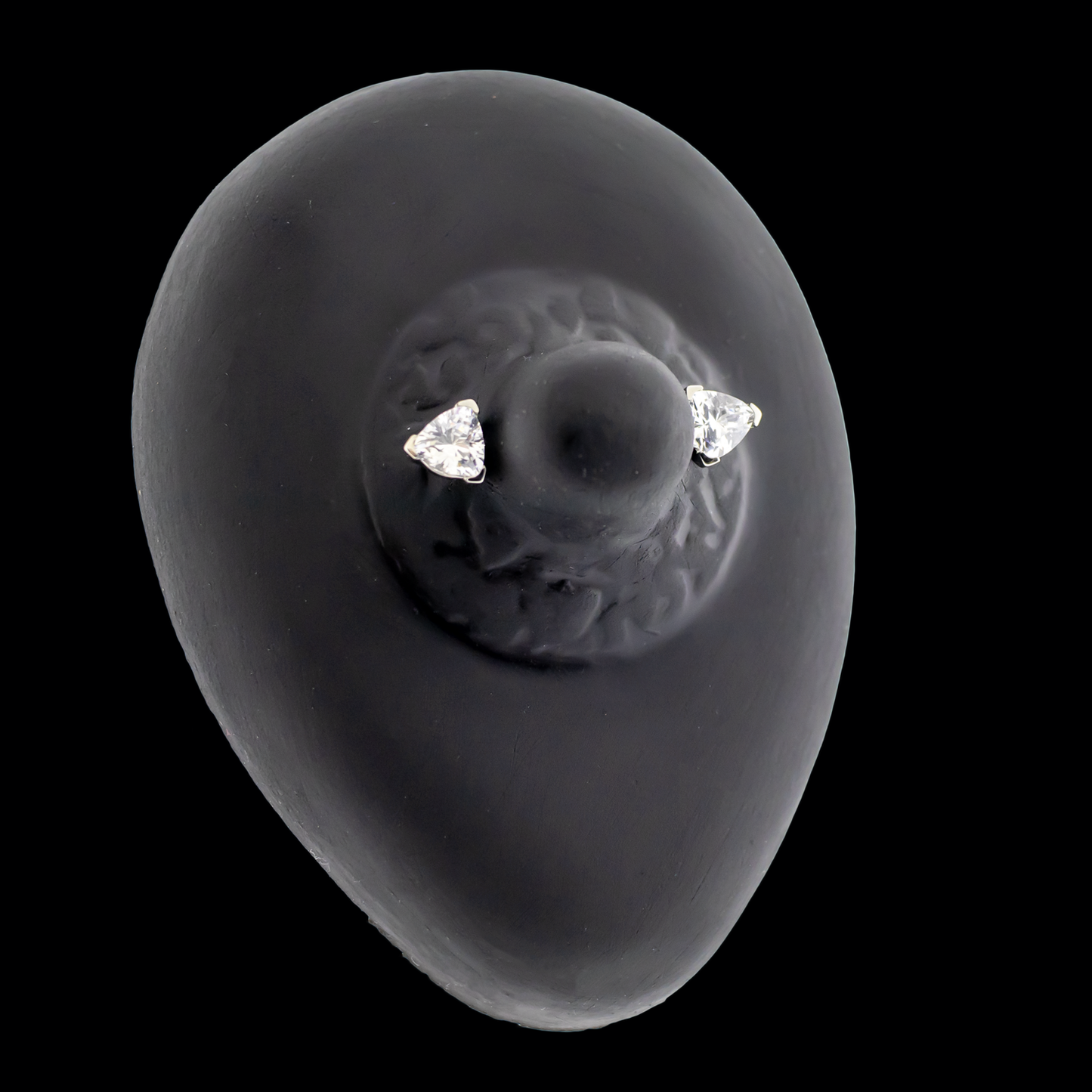 The front-facing threadless design crafted in ASTM F-136 titanium features a low profile stunning trillion cut premium craft zirconia with a wide prong setting and flat back.
