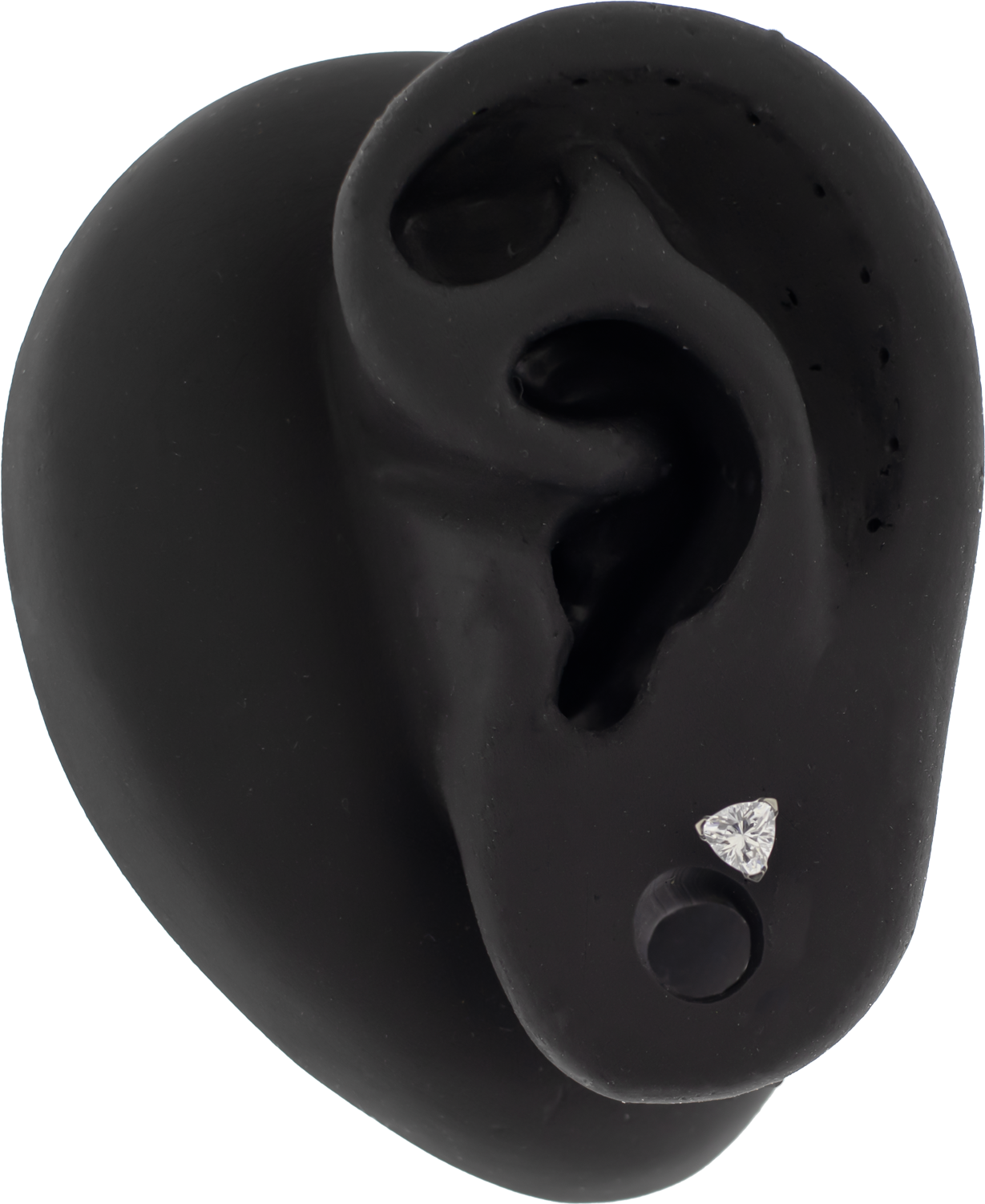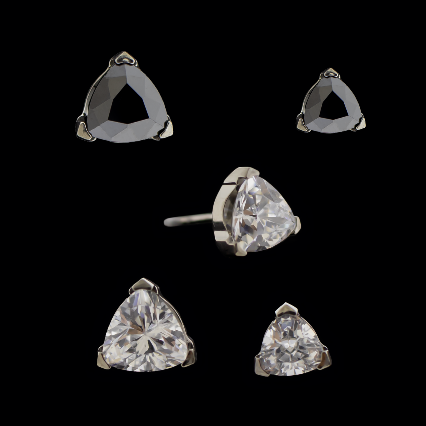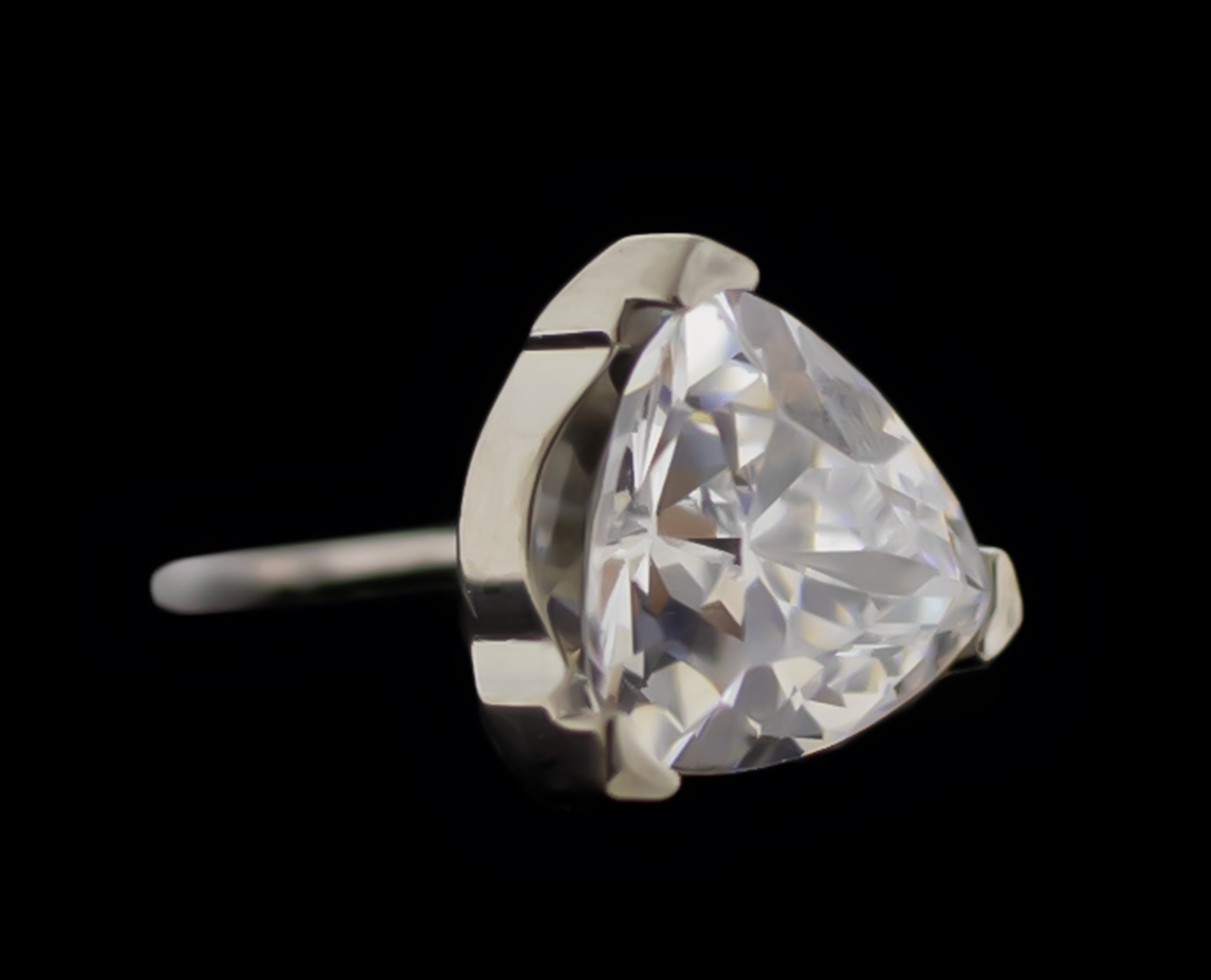 Indulge in the lavishness of Keon's low profile titanium prong set end, adorned with a spectacular trillion cut zirconia and featuring a wide prong setting and flat back for a touch of opulence.