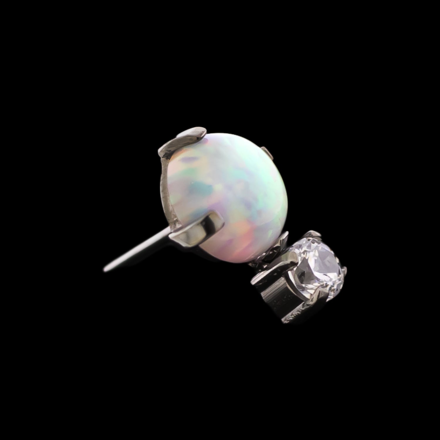 Talia blends the finest ASTM F-136 titanium with the complimentary looks of a synthetic opal and a premium crystal dangle. Together, these two prong-set gems provide you with the naturally glamorous look you've been wanting. This piece is sure to be a hit in your shop.